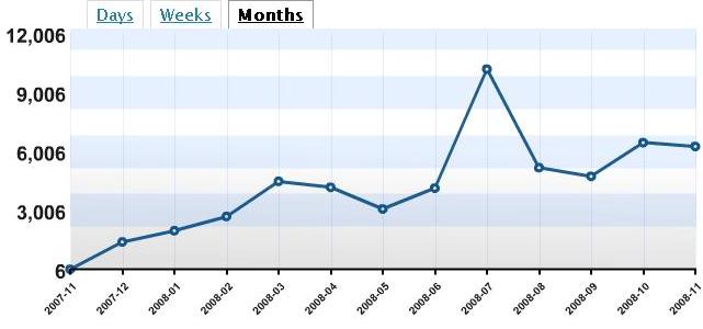 Traffic has risen slowly and steadily to an average of about 4500 to 6000 views per month. This is about 150 to 200+ per day with occasional spikes. Unique visitors per day average about 75 to 100 per day.
