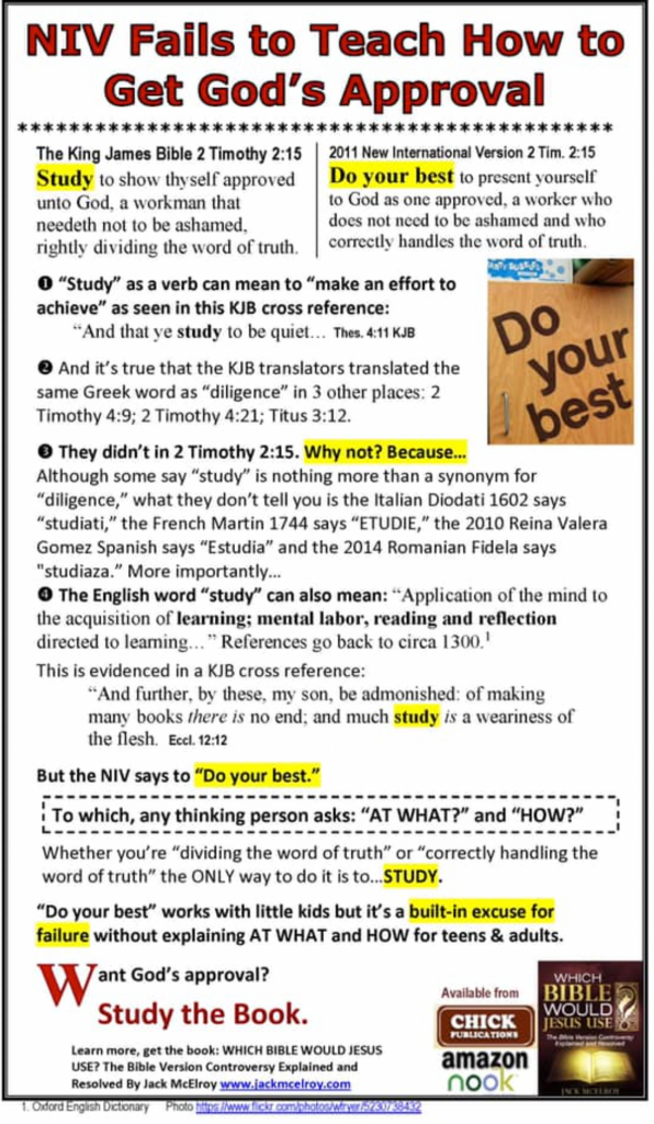 The particular text in dispute here is 2 Timothy 2:15 wherein it is alleged that the NIV “Fails to teach how to get God’s approval” The guy who posted the meme then made a side comment that Modern translations “ . . .. made a change only for the sake of changing things to get their copyrights, make money, and to undermine the Christian’s faith in an inerrant Bible.” Here’s the meme and below is my counter argument to the issues.