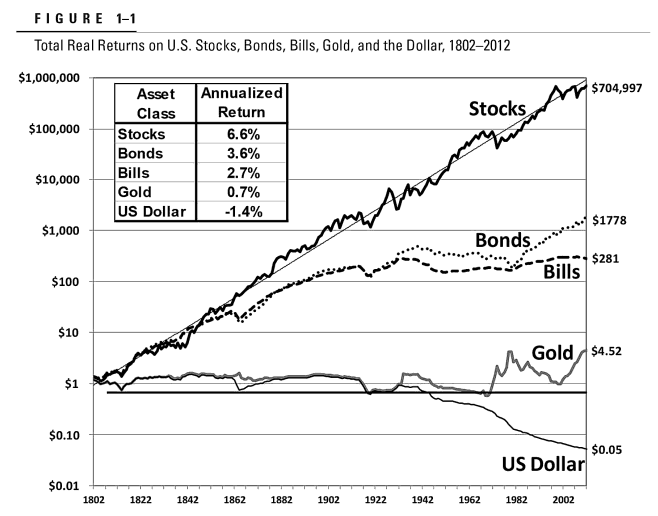 In the book of Prof. Jeremy Seigel entitled “Stock for the Long run,” he cited numerous case studies regarding this matter. The graph below indicates how stocks have beaten bonds and other vehicle of investments.