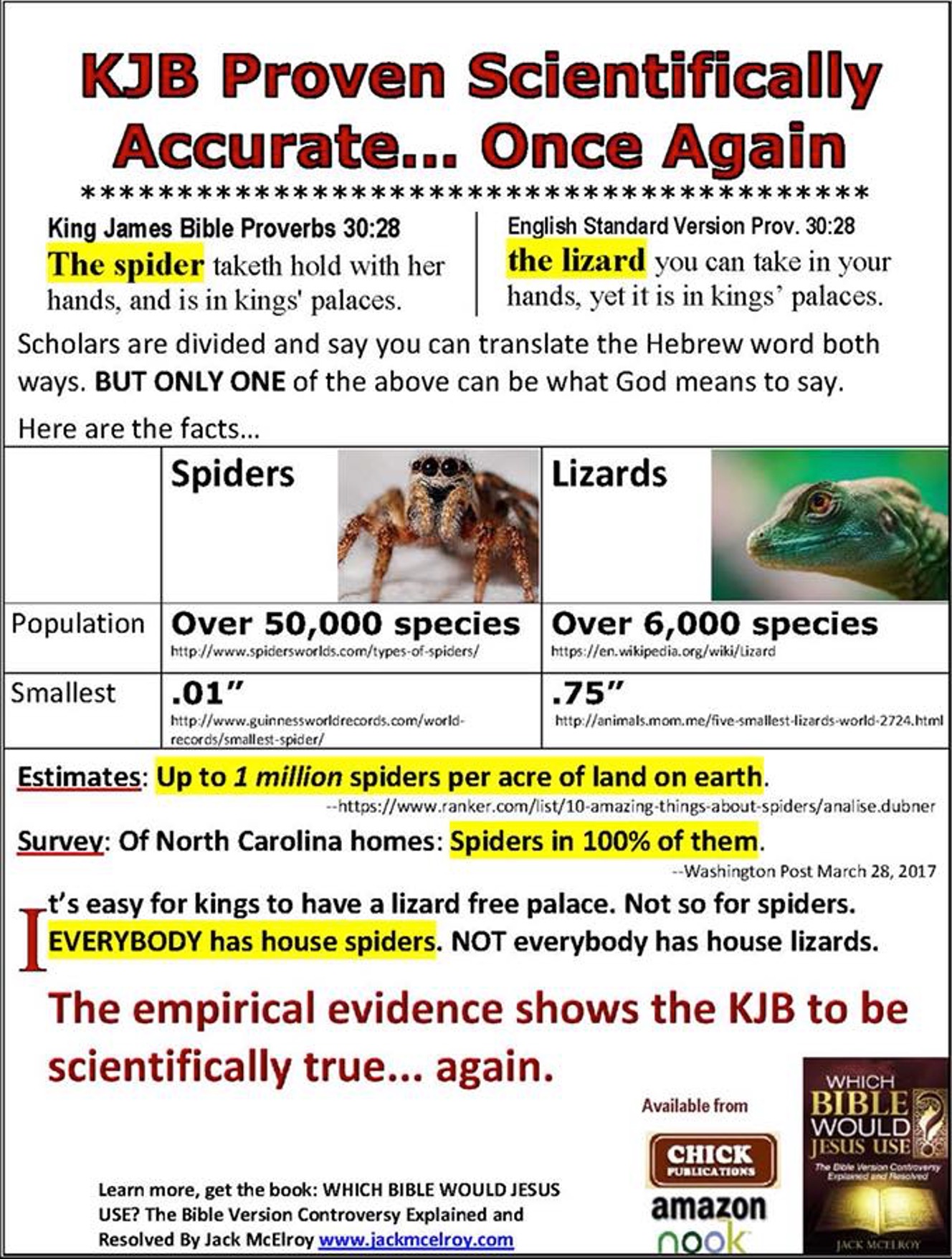 Conclusion: The King James is scientifically true since it states that the “spider” taketh hold with her hands is in the King’s palace. (As it could be said that it is easy for Kings to have a lizard free palace, but not so for spiders as EVERYBODY HAS HOUSE SPIDERS. Not everybody has house lizards.)