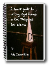 Whew !!! Finally I finished another ebook project entitled “A Dunce guide to writing legal forms in the Philippine bar exams” This short but very useful 15 page ebook for law students and bar exam candidates is now ready for download. The good news about this is that I AM GIVING IT AWAY ABSOLUTELY FREE !!! For some people, writing legal forms is the hardest part of the last exam in the Philippine bar exams. This is probably because legal forms take some much time to memorize and there are hundreds of legal forms that you should be familiar with. Six months into my review period I already anticipated this problem so instead of crossing my fingers and relying upon luck, with the help of my “Bar buddies.” I developed my own system on how to tackle legal forms. If you have a blog, help spread the word, about this free and very useful guide in writing legal forms in the Philippine bar exams. So what are you waiting for? Grab your copy now of “A Dunce guide to writing legal forms … [Read more...]